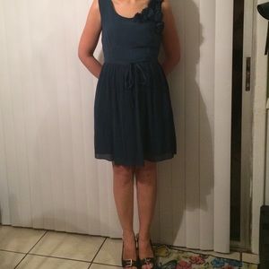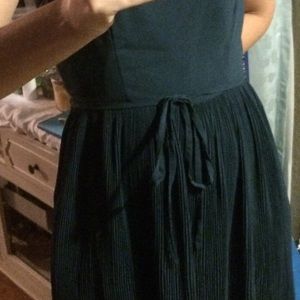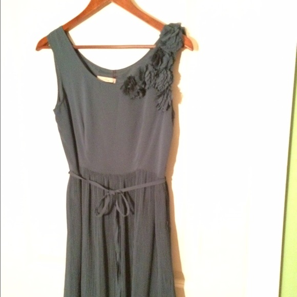 Color is turquoise. Fabric is light and airy. Feminine flowers by neck line. Matching belt. Pleated skirt. Fabric does not easily wrinkle. EUC