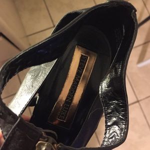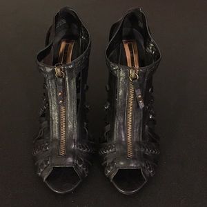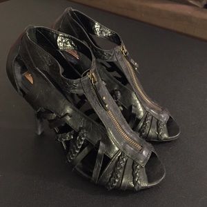 distressed leather ... braided straps ... center zipper ... round peep toe ... 4 ½" stacked heel