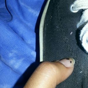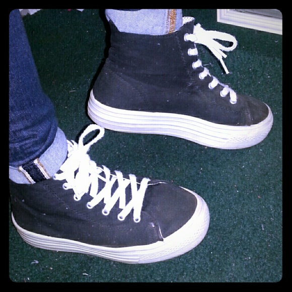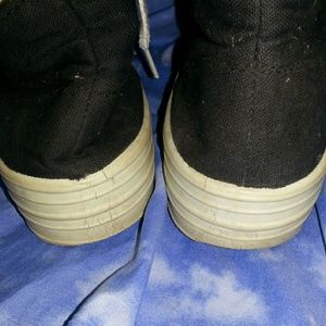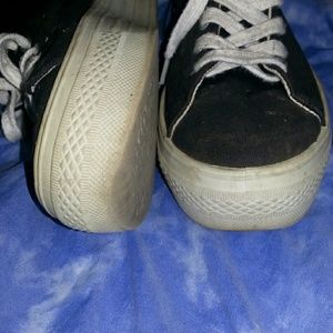 Black and white platform sneakers. Pretty dirty due to storage. Worn, they were my favorite shoes at one point. Still in tact for the most part. The last picture is showing how the cloth material is sort of separating from rubber. This is happening in both upper "corners" of both shoes.