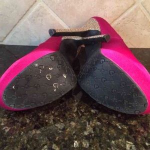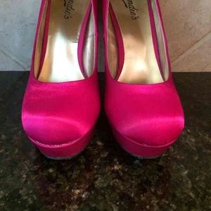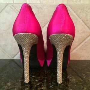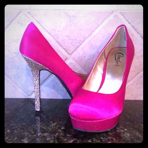 Brand new, unboxed By: Candie's, size: 7.5 Fuchsia satin covered high heels. Heel itself is covered in gold and silver jewels. Never worn other than to try on around the house. Too small for me. *Possible Flaw* - See picture three. The glue seems to be showing slightly. Not noticeable at all when worn as it is under the front. Just wanted to mention. Price reflects this "defect" if you want to call it that?
