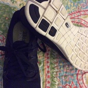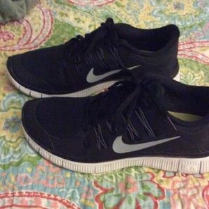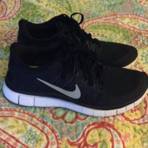 Nike Free 5.0+, women's black, 9.5 shoes. I may have worn these shoes three times at the most. They were brand new when I purchased them. I would consider them NWOB. These Nikes fit a half size small, so if you usually wear a 9, you would need these in a 9.5. They are black/white/ platinum. (The swoosh is a silvery, platinum.)