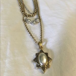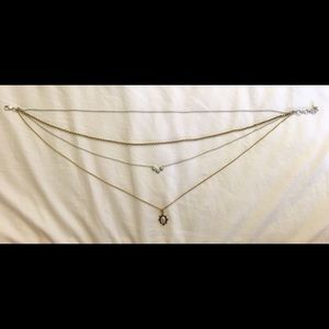 Another beautiful layered necklace. Simple and subtle, perfect for sweaters or a basic tee with a leather jacket. The shortest chain is 18" the longest chain is 23". Lobster claw closure mixing gold/bronze with silver. 4 chains 2 of which have stones or metal accents. Another versatile piece that works easy into your wardrobe. Missing tags, but never used.