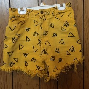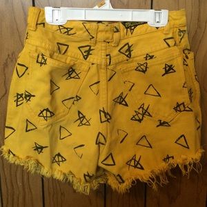 Sold in a bundle. 80s print. Black tribal triangles print on yellow high wasted frayed Jean shorts. Super cute and unique. Would go great with just about anything, boots/converse, a cool graphic tee. Shorts say size 7, snug at the waist. They fit like a 26.