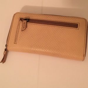There is never too many wallets! Super cute fossil wallet. 100% authentic. Only used twice- looks brand new! Has 12 small slots, two big slots and a zipper for change in the middle. It has a back pocket.