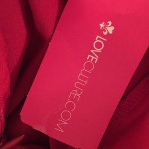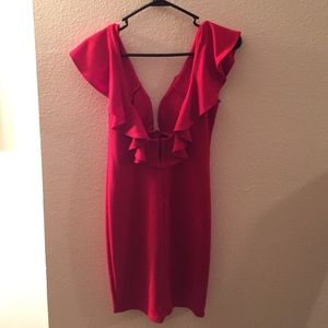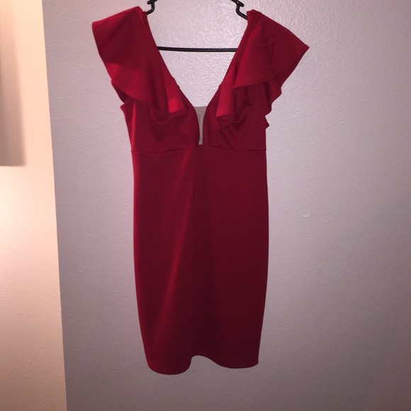 Very flattering red dress with flowing sleeves and a low V in the back . Never been worn. Bought it for going out in Kansas City and never ended up wearing it.