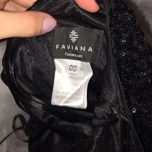 STUNNING, SEXY, FAVIANA PROM DRESS. WORN FOR 6 HOURS. it is completely covered in black sequins and has a mesh top, and mesh slits down the front. Open back and zips at the top and bottom of cut out. I am 5'5 and 110lbs and it fits me PERFECT although it has about and inch and a half of extra length but heels will fix that. I bought it an year ago and the retail was $518. I do accept offers! PLS ASK FOR MORE PICS!!