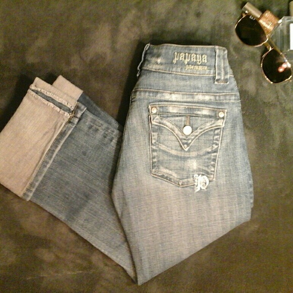 Papaya premium denim cropped jeans, lightly distressed, straight leg, excellent condition, super cute embroidered details