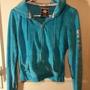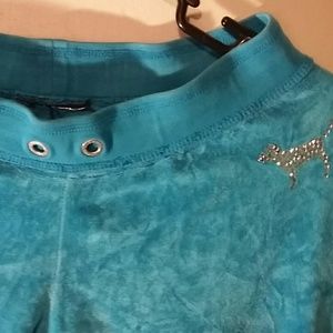 Teal blue Velour outfit with bling on behind says Pink, and sleeve says Give Pink with a heart in the middle. No jewels are missing, only flaw is one pocket on hoodie is torn a bit but not too noticeable. Price is negotiable must be reasonable Only thing missing is ties.