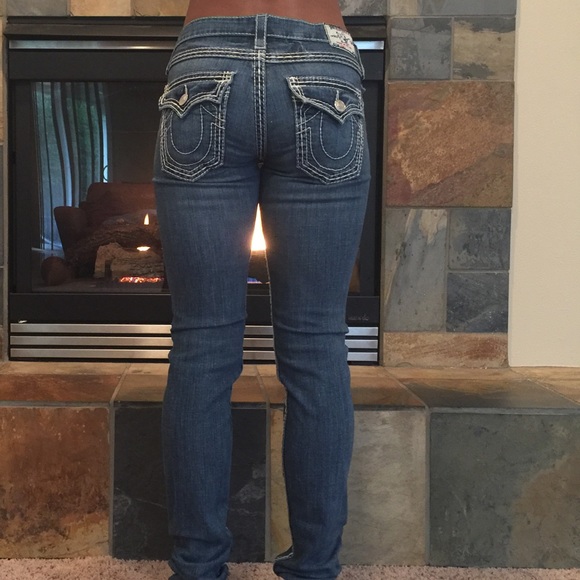 I sure hate to part ways with these! Gorgeous slightly distressed True Religion Skinny Jeans. Style: Skinny inseam: 34 inches rise: 81/2 inches. Great gently used condition only worn a couple time because I really wear a 27.