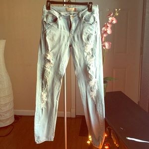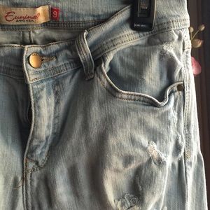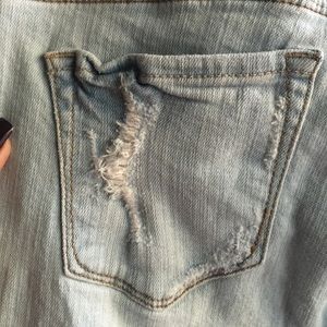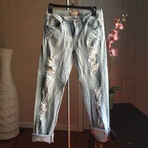 Light blue wash, distressed straight leg jeans. Size 9. Stretch. In good condition. Looks cute cuffed with ankle booties and a crop top. 30" inseam.