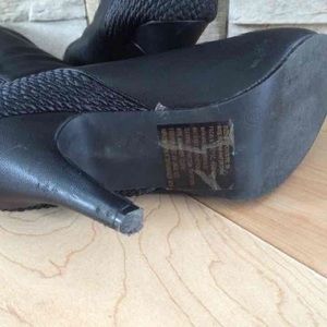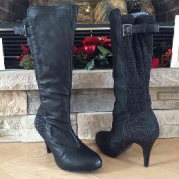 Tall black heeled boots. Size 8. Brand unknown. Great condition, minimal wear on heels. Please see all pictures! Faux buckles on backs, stretchy material on back as well to accommodate wide calf if needed. 16" calf. 3.5" heel!! Worn maybe four times! Love them but I don't have enough places to wear them so they just sit in closet!