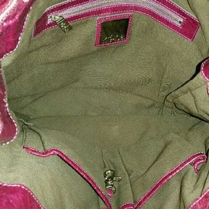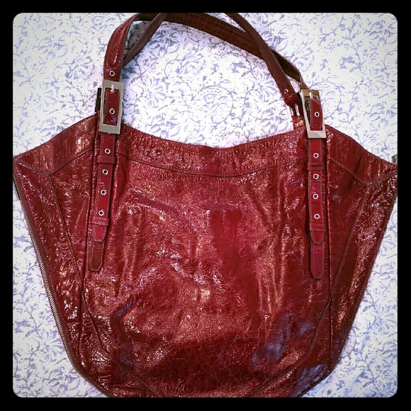 Beautiful dark plum patent leather Kooba bag. Bag is pre-owned so shows signs of wear but is in very good pre-owned condition. Only flaws in leather are 2 tiny little black dots on back of bag. Small so hard for camera to pick up. Interior is flawless and hardware shows minimal small scratches here and there. Bag can unzip on the sides for even more room. Inside has 2 slip pockets and one zip pocket. Worn by Blake Lively and Audrina Patridge. Comes with original dustbag