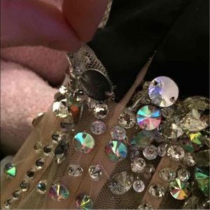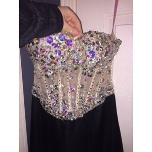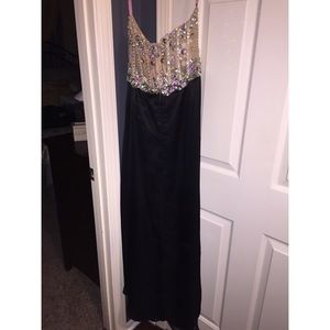 This dress is a size 10, but I wear a 6-8 and it fit me perfectly! The brand is blush prom, I bought the dress at a local store in Columbus Ohio. It is a little see through in the middle but not too much, it is a unique touch. I am 5'3 and wore heels, and the dress reached the floor just a little bit. I paid $450 for this dress originally. There is one flaw to the dress that could easily be fixed, the flaw is shown in the 4th picture. Any questions please ask!