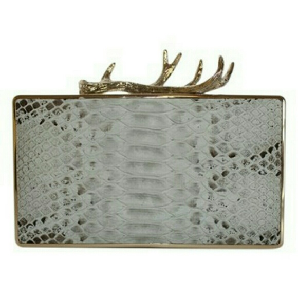 Timeless yet exotic, this Antler box clutch features luxe python and dramatic hardware for an instant statement. Signature orange suede lining. Matte Finish. Magnetic closure and interior pocket. Gold hardware.