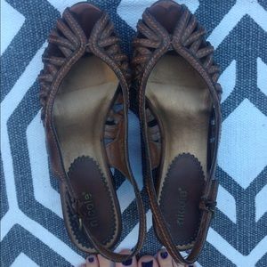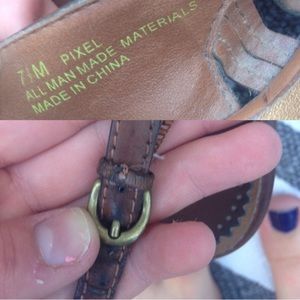 Brown wedges size 7 1/2. Not too high! Great with any trendy bohemian outfit:) buckle is warn but good condition! Made with man made materials