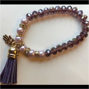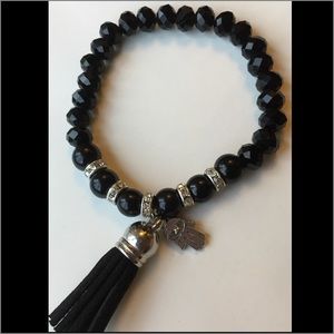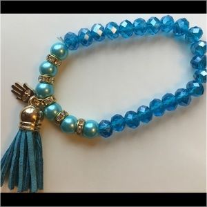 Handmade bracelet with glossy beads and Hamsa pendants and a tassle <- nice girly touch :)