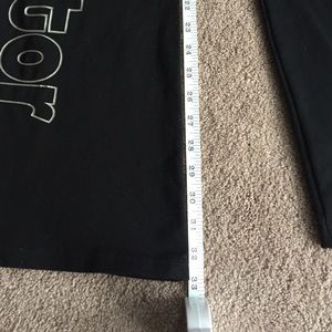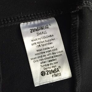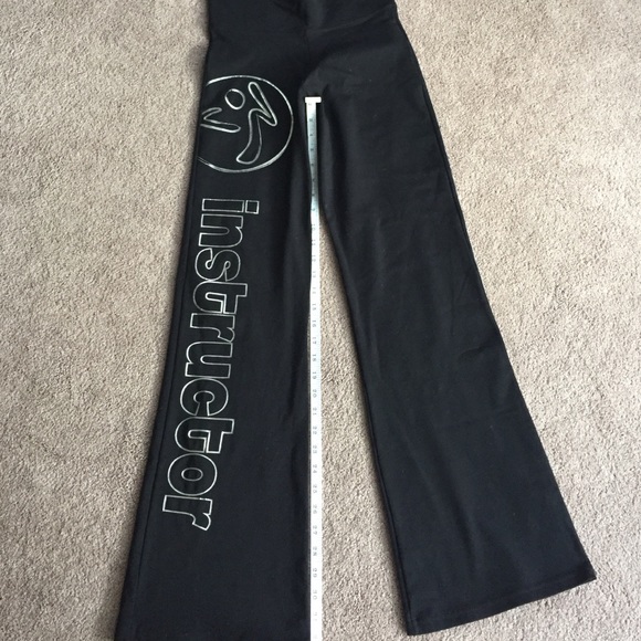 33"inseam black boot cut stretch pants with Zumba logo/instructor silver imprint on right leg.