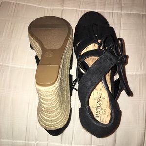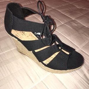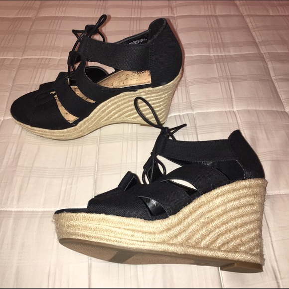 Black wedges by Merona for Target. I took the tag off but never wore them so I still have the tags! I thought I bought the correct size but they're a little too big for me. They tie up with black laces with gold end caps. They're 4 inches tall and super cute. Let me know if you have any questions!