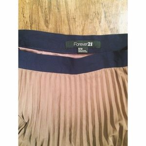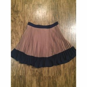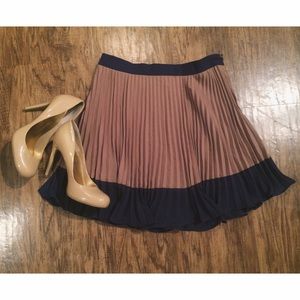 + high waist pleated tan and navy fit and flare mini skirt. zips on the side with hook & eye closure