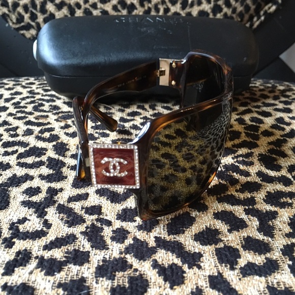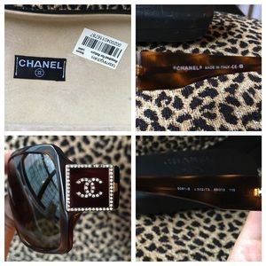 Chanel sunnies with rhinestone interlocking C's. Good used condition! A few MINOR scratches on the lenses - nothing noticeable and certainly not vision impairing. 2 rhinestones are missing from the left side as shown. Case is in used condition. These are from many years ago so obviously I don't have the receipt, but the Bloomingdales return sticker is the same thing! Any more questions please ask!