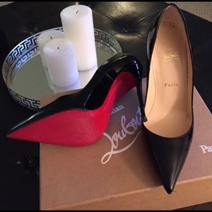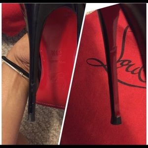 Authentic + bought from Barneys. Patent Leather CL Pump, red protective sole already in place, 2 small scratches on the back and inside of right shoe on heel as shown in above picture, only worn 3 times!! Can barely see scratch! Dust bag and box included! Price reduced inconsideration of scratch! Willing to negotiate thru 🅿️PAL!