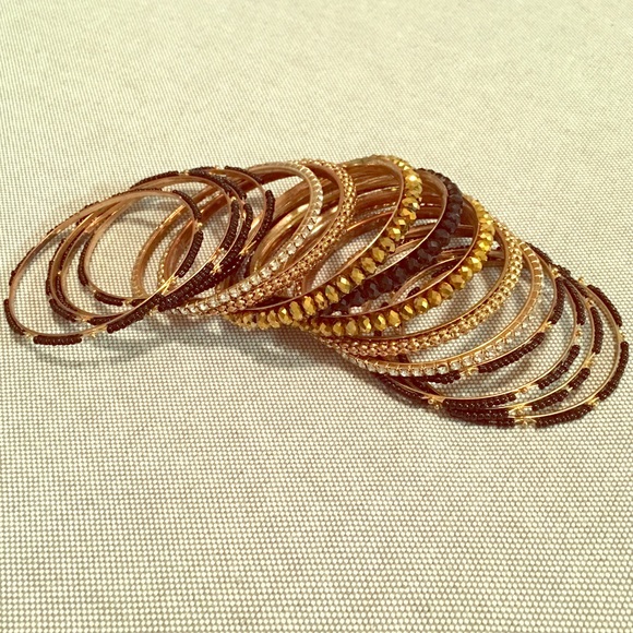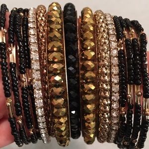 💫 8 tiny black beaded bangles 💫 2 crystal bangles 💫 2 chunky gold bangles 💫 2 gold big beaded bangles 💫 1 black big beaded bangle Super cute!!!!
