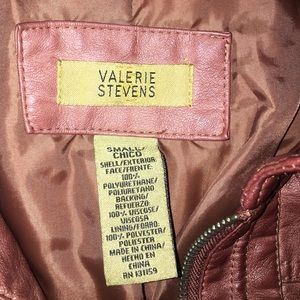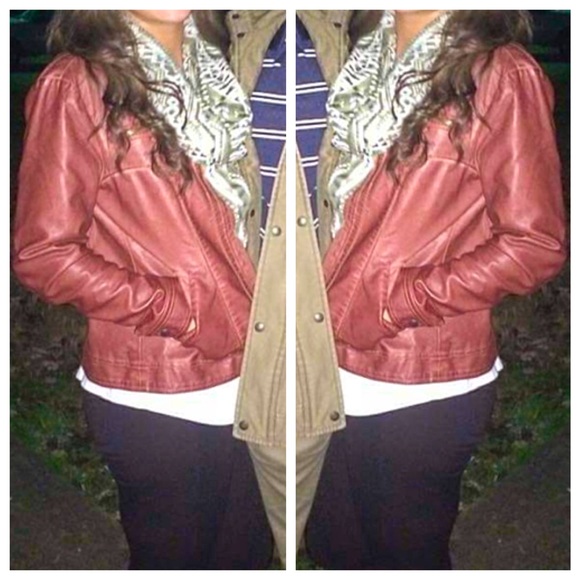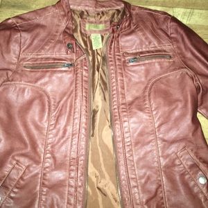 faux leather jacket. Worn 1-2 times. No marks, holes, tears--great condition. It's a size small, but may fit a little bigger. I usually wear a medium in jackets, and this fits me well.