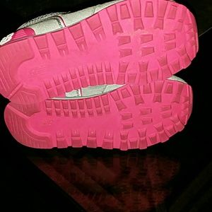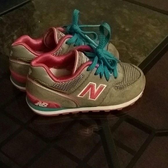 I have here toddler girl size 7 new balance they have been worn but still looks good color is gray pink and blue