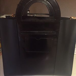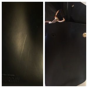 This is a great sophisticated handbag. Comes with long cross body strap. The front has little scratches and the right side has a missing snap as depicted in the last picture. Price does depict those flaws. Other then that though this purse is in flawless condition, I only carried it a handful of times.