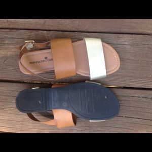 Dress up or down in these gold and tan thick strapped sandals with adjustable back strap. Perfect condition!!!!!! Size 8 (could fit 7 1/2) very comfortable.