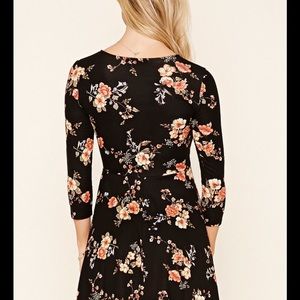 A jersey knit, faux wrap mini dress featuring a floral print, v-neckline and 3/4 sleeves.
