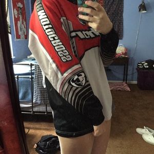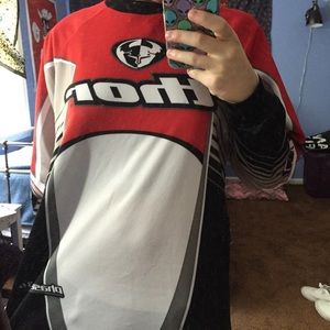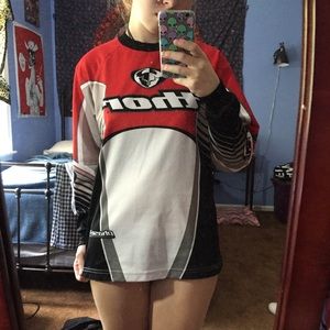 i used to love this top so much, but it's just been sitting in my closet forever! i believe this is a legit motorcross tee, you can definitely play sports and sweat in this material if you get what i mean. it is in pretty good condition besides a few little spots and piling that are going to happen regardless! fits oversized, probably up to a medium, unisex.