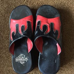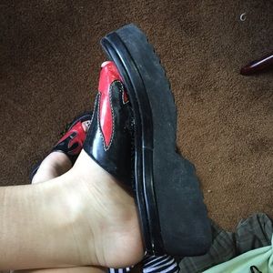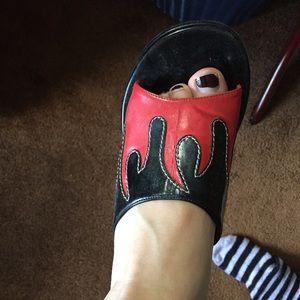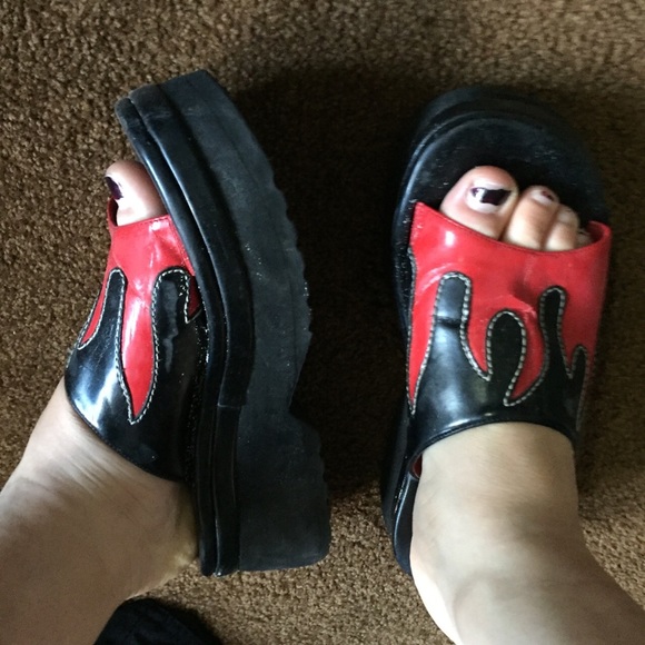 these shoes are so so cute and perfect for the warmer seasons! the bottom is a hard foam-like material and the top is a bendy type of material that the flames are sewn onto. the only real flaws are that they creased a bit on the top and the Harley Davidson logo on the shoes is wearing off, which will happen regardless overtime.