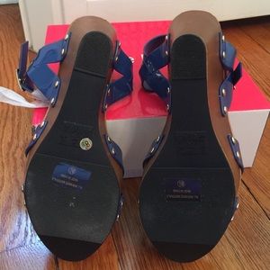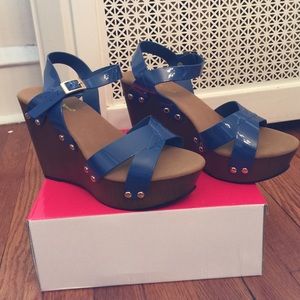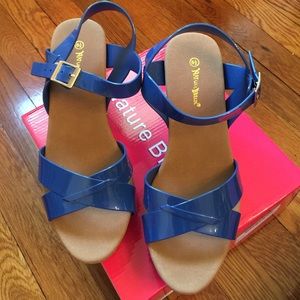 These navy blue patent leather type wedge sandals are perfect for summer! I purchased the wrong size online so I have to sell them 😢. Very comfortable. Never worn!!
