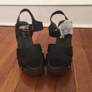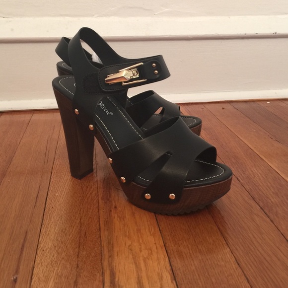 These black leather sandals have a gorgeous wooden dark brown heel/sole and they are also decorated with gold studs on the side. They also have a metal gold buckle that sets the whole show off!! Super cute!! Never worn!!