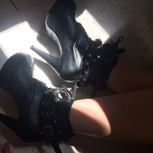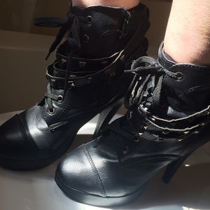 Studded Heeled Boots. Laced up but also have zippers so you never have to untie them. 4 inch heel. Also 3 straps with studs on each boot. Super cute! They just don't fit me :(