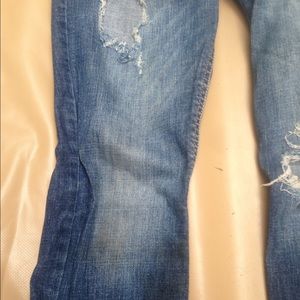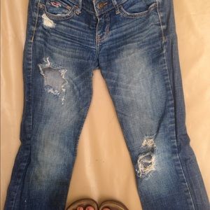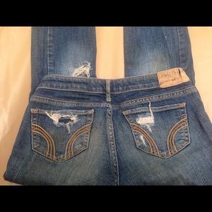 These are a size 1 short distressed Hollister jeans. They are a straight leg, so they look really cute cuffed. Has some staining from mud on the front right leg, and back on the butt (as pictured) not noticeable when wearing. Feel free to make an offer. 💜 cheaper on ♏️ercari.