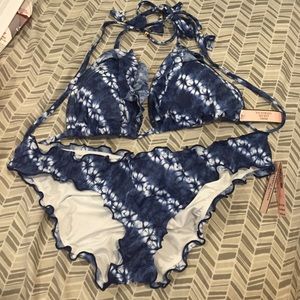 Victoria's Secret ink blot bikini. Brand new and never worn. These sizes are not sold in stores or online! The top is a large and bottoms are a small. This is on merc for only $45!!!
