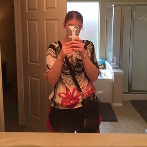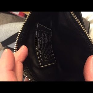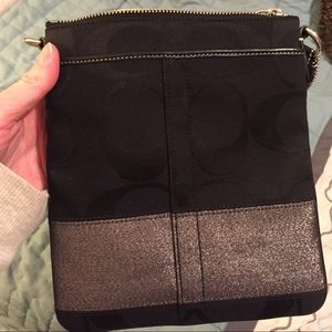 Black bag from Coach has been gently used. Well taken care of. No stains, rips or holes. In good condition. Just don't use it anymore. Length of the actual bag is 8.5 and width is 7.5. There is one open pocket in the front. Has an adjustable strap. Makes a great travel bag :)