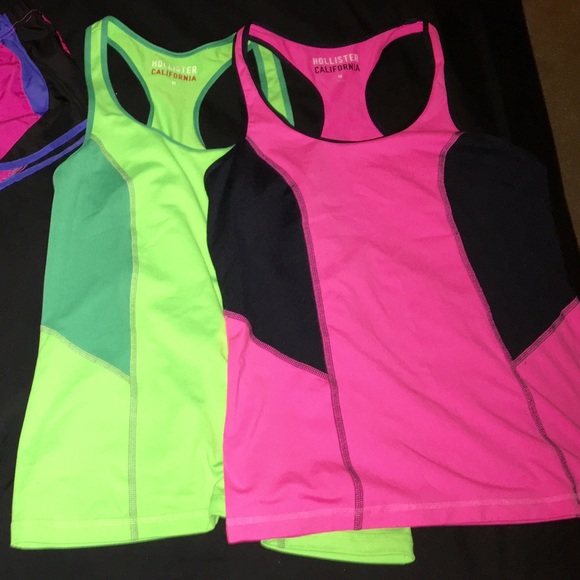2 M Hollister workout tops with very stretchy material. One bright lime green and one bright hot pink. Light, breathable material makes them perfect for a long hard workout or some morning yoga.