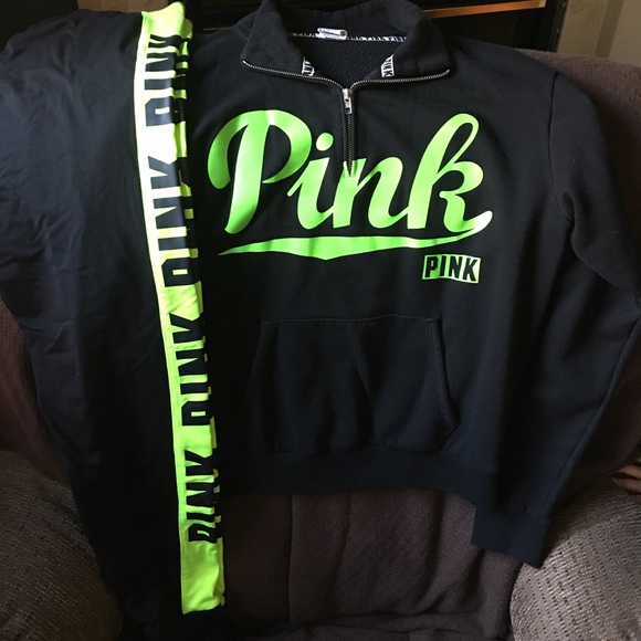 Black and fluorescent green VS Pink set in EUC. Half zip sweatshirt is size medium and ultimate pants size small. The green on the pants is just slightly lighter but cannot tell when worn together. Very cute and comfy set!