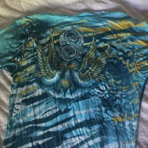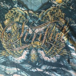I have only worn this shirt once. It is too beautiful to be sitting in a drawer! Bought it from the buckle. All jewels in place. Jewels and decal on the back as well.