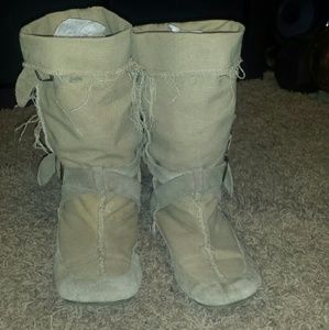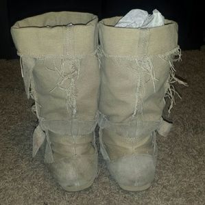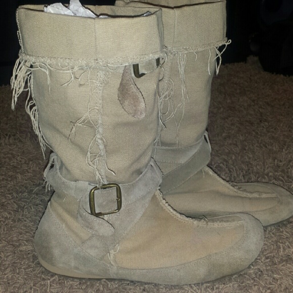 Tan canvas moccasin inspired below the knee boots with fringe and buckles. Some signs of wear.