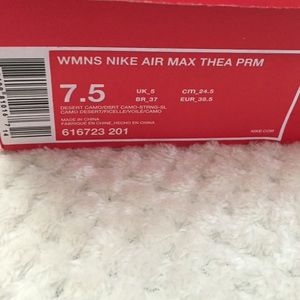 Nike Air Max Thea PRM in desert camo. These sneakers are brand new, never worn. They are beautiful but ended up not being my style. If you have a wide foot these run a bit small. Smoke free and pet free home. NO TRADES. PRICE NEGOTIABLE. CHEAPER ON M.