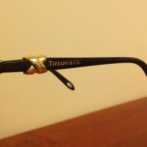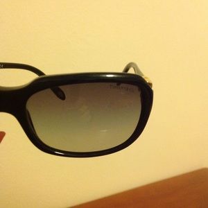 Pre-owned black Tiffany signature sunglasses with gold accents. Comes with box and case, cleaning cloth, and original paperwork which matches the inscription in the lens. These are beautiful but do have very light scratches on both lenses. Tried to take the best pictures to show. These were $290 sunglasses.