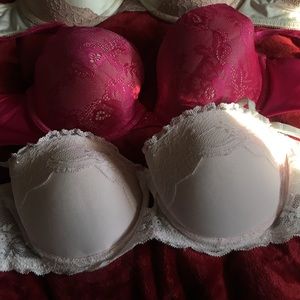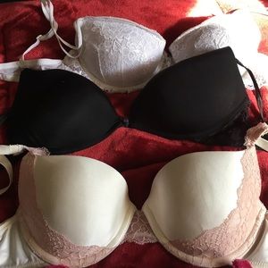 All 34-36 C. Fit me all the same so i'm selling them as a bundle. I don't wear bras anymore so i've got a lot to get rid of. Most are pretty new still, no stains, only wore a couple times. All are somewhat padded. All cute bras. All also have some sort of lace.