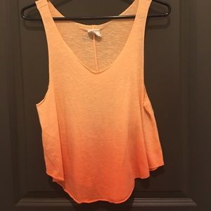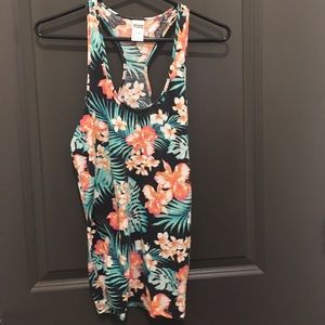 This is a listing for TWO tops in good condition. Black floral is fitted and orange is a loose kind of sheer tank.
