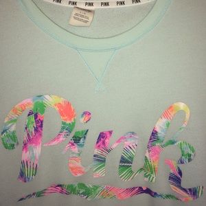 Gently-worn PINK crewneck in a lightish-blue/green with tropical patterned wording.