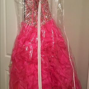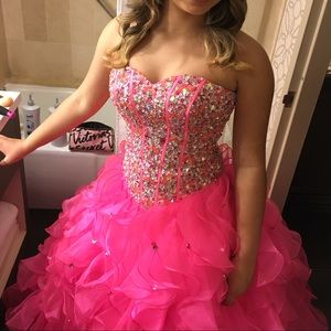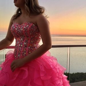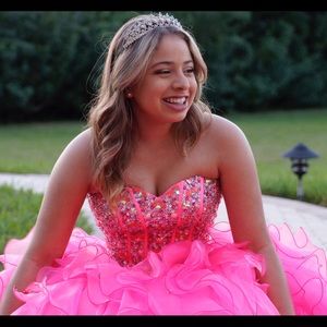 Beautiful gown. Size 2 adjustable up too 2-3 sizes up because of adjustable corset. Gorgeous gown for prom or quince sweet sixteen celebration only worn for photoshoot!