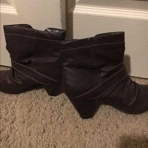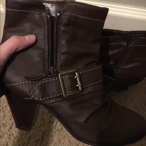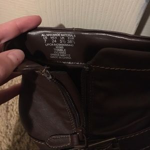 All handmade. Cute gold buckle on sides. Dark brown and small heels.